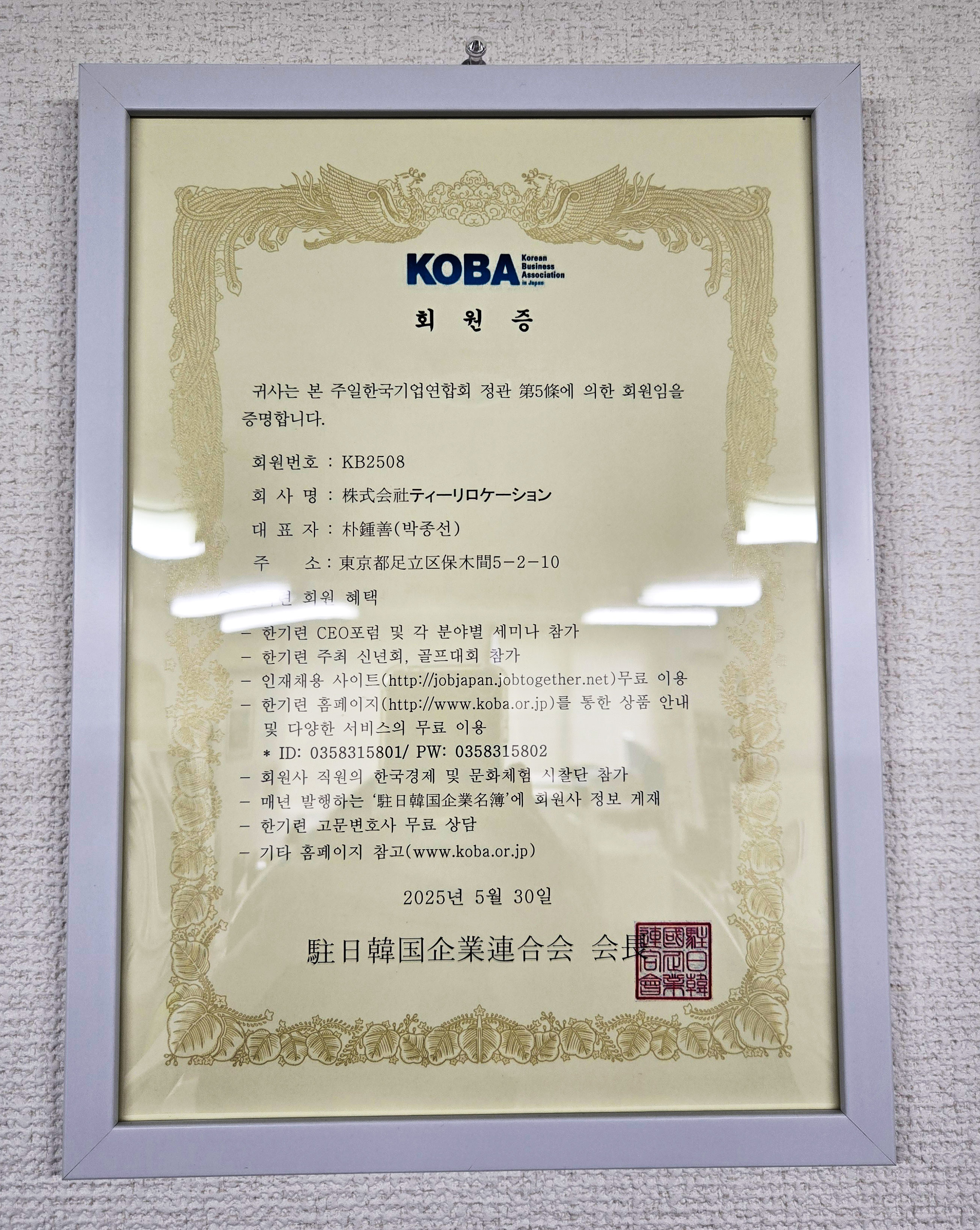 보다 나은 서비스와 폭넓은 혜택을 제공해 드리기 위해 저희 회사는 주일한국상업연합회 (KOBA)의 정식 멤버쉽에 가입하게 되었음을 알려드립니다.